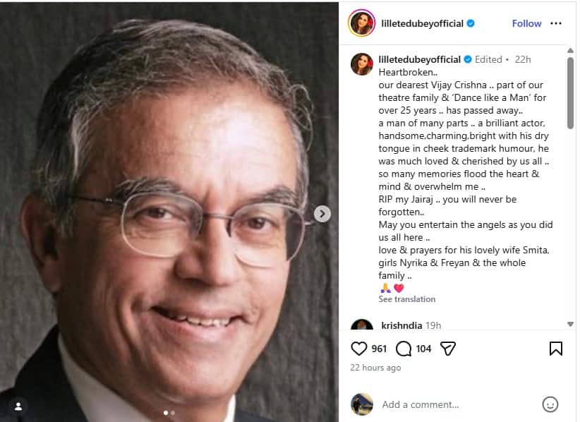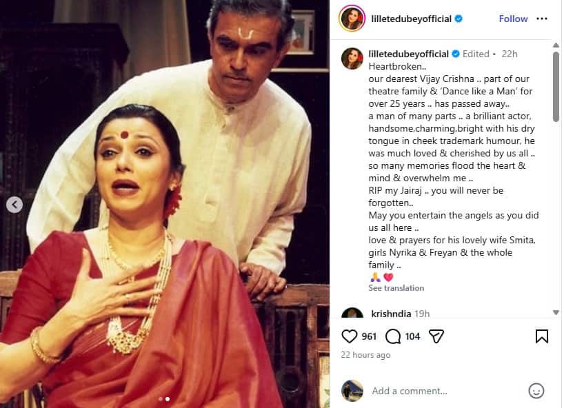 એક્ટ્રેસ લિલેટ દુબે દ્વારા ઈન્સ્ટાગ્રામ પર પોસ્ટ શેર કરવામાં આવ્યું જેમાં તેણે લખ્યું કે ‘દિલ ટૂટી ગયું.. અમારા પ્રિય વિજય કૃષ્ણા કે જેઓ 25 વર્ષથી વધારે સમય અમારા થિયેટર પરિવાર અને ડાન્સ લાઈક એ મેનનો ભાગ નથી રહ્યા. તેઓ એક બહુમુખી પ્રતિભા ધરાવતા ધનવાન વ્યક્તિ હતા. એક શાનદાર એક્ટર, હેન્ડસમ, આકર્ષક અને મજેદાર ટ્રેડમાર્ક હ્યુમર સાથે અમે બધાને પ્રેમ કરતા હતા અને સંભાળીને રાખતા હતા. ઘણી બધી યાદો દિલ અને દિમાગમાં ભરાઈ ગઈ છે. RIP મારા જયરાજ તમને ક્યારેય ભુલાવી નહીં શકાય. આ પોસ્ટ પર અનુપમ ખેરે કોમેન્ટમાં લખ્યું, ‘ઘણું દુખદ છે. ઓમ શાંતિ.’ આ સાથે જ સબા પટૌદીએ લખ્યું કે આ ઘણી ખરાબ ખબર છે. આમના પરિવારજનોને મારી સાચી સંવેદના છે.’